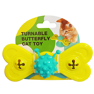 This is our company's original patented product, featuring a butterfly-shaped design. The suction cup at the bottom allows it to be fixed to a flat or vertical surface. Driven by the cat's paw, it quickly spins like a windmill. Two catnip balls are inside the side cavities to attract the cat's attention and increase playfulness. The raised dots in the middle allow the cat to rub its face, fur, or chew on its teeth. Using it with cat toothpaste or treats enhances its teeth-cleaning effect.