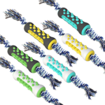 Our company's original patented product features a durable, chew-resistant pet teething toy design. It combines a hard nylon shell with a soft inner core, and its newly designed cleaning channels and serrated teething protrusions provide superior oral cleaning power compared to similar products on the market. This product comes with a chew rope.