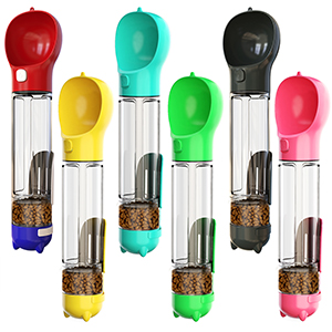 This is our original patented product, a multi-functional portable pet travel water bottle with a super-large 500ml capacity. Made from new environmentally friendly materials, it is heat-resistant, dishwasher safe, and will not deform or leak. It can be operated with one hand, making feeding easier, and includes a dog food container. The large button design allows for one-touch water dispensing and also features a backflow function. It also includes a pet waste cleaning shovel and pet waste storage bag.