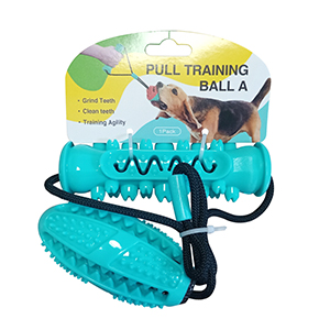 This is our company's original patented product, which can be used as a water toy. It's a toy set assembled from two dog chew toys: a treat-dispensing ball and a serrated chew stick. It combines multiple functions such as interaction, treat dispensing, and chewing. It can also be used as a training ball to improve a dog's agility. It can be used by the dog for independent play or for interaction between owner and pet, strengthening the bond between them.